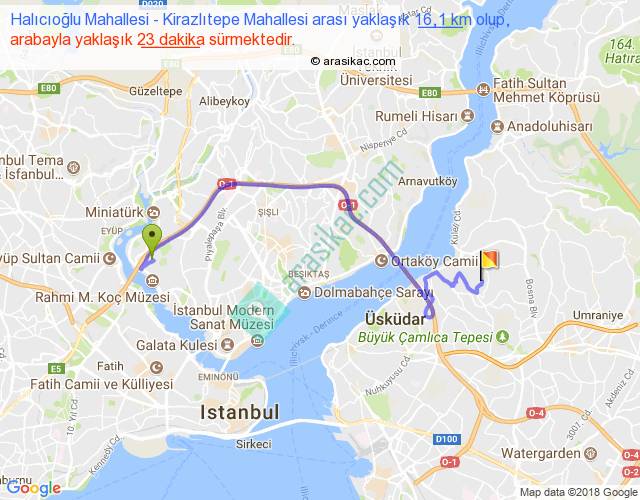 Halıcıoğlu Mahallesi - Kirazlıtepe Mahallesi arası yaklaşık olarak 90 km/h ile yukarıda belirtilen sürede olup, iki yerin kuş uçuşu uzaklığı (mesafesi) 9'dir. Yolculuk otobüsle 29 dakika sürmektedir.