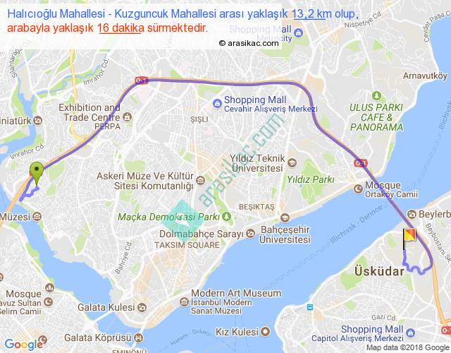 Halıcıoğlu Mahallesi - Kuzguncuk Mahallesi arası yaklaşık olarak 90 km/h ile yukarıda belirtilen sürede olup, iki yerin kuş uçuşu uzaklığı (mesafesi) 8'dir. Yolculuk otobüsle 20 dakika sürmektedir.