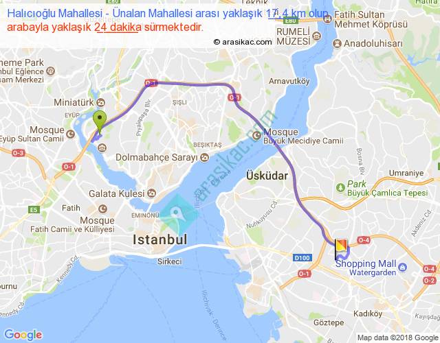 Halıcıoğlu Mahallesi - Ünalan Mahallesi arası yaklaşık olarak 90 km/h ile yukarıda belirtilen sürede olup, iki yerin kuş uçuşu uzaklığı (mesafesi) 11'dir. Yolculuk otobüsle 31 dakika sürmektedir.