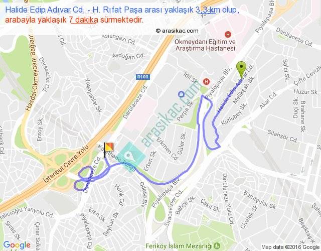 Halide Edip Adıvar Cd. - H. Rıfat Paşa arası yaklaşık olarak 90 km/h ile yukarıda belirtilen sürede olup, iki yerin kuş uçuşu uzaklığı (mesafesi) 1'dir. Yolculuk otobüsle 9 dakika sürmektedir.