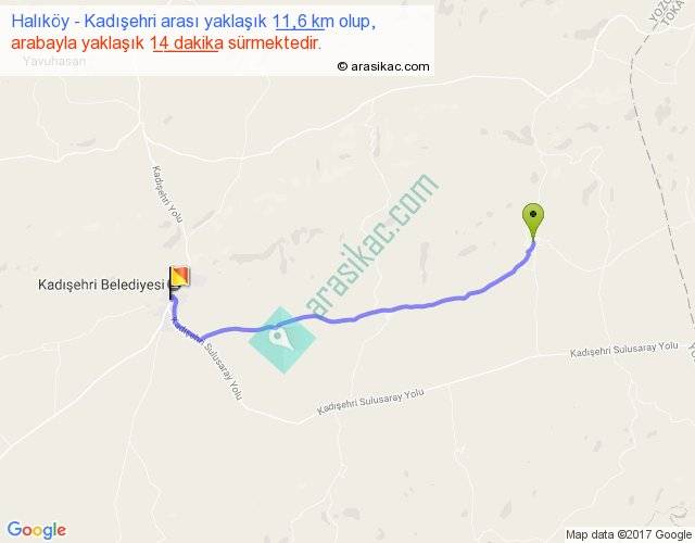 Halıköy - Kadışehri arası yaklaşık olarak 90 km/h ile yukarıda belirtilen sürede olup, iki yerin kuş uçuşu uzaklığı (mesafesi) 10'dir. Yolculuk otobüsle 18 dakika sürmektedir.
