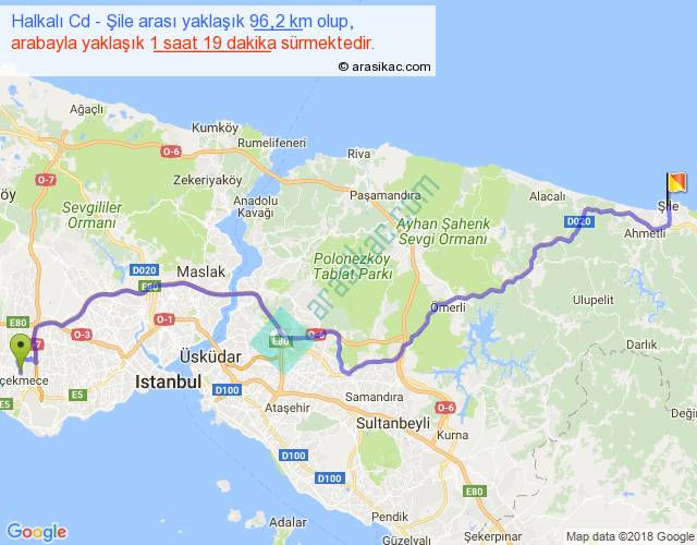 Halkalı Cd - Şile arası yaklaşık olarak 90 km/h ile yukarıda belirtilen sürede olup, iki yerin kuş uçuşu uzaklığı (mesafesi) 70'dir. Yolculuk otobüsle 1 saat 42 dakika sürmektedir.