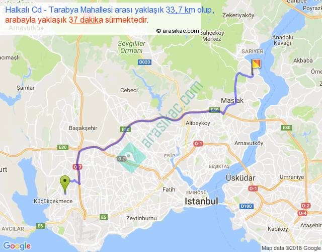 Halkalı Cd - Tarabya Mahallesi arası yaklaşık olarak 90 km/h ile yukarıda belirtilen sürede olup, iki yerin kuş uçuşu uzaklığı (mesafesi) 25'dir. Yolculuk otobüsle 48 dakika sürmektedir.