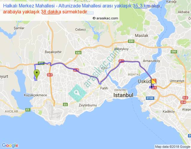 Halkalı Merkez Mahallesi - Altunizade Mahallesi arası yaklaşık olarak 90 km/h ile yukarıda belirtilen sürede olup, iki yerin kuş uçuşu uzaklığı (mesafesi) 22'dir. Yolculuk otobüsle 49 dakika sürmektedir.