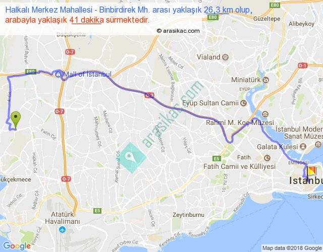 Halkalı Merkez Mahallesi - Binbirdirek Mh. arası yaklaşık olarak 90 km/h ile yukarıda belirtilen sürede olup, iki yerin kuş uçuşu uzaklığı (mesafesi) 17'dir. Yolculuk otobüsle 53 dakika sürmektedir.