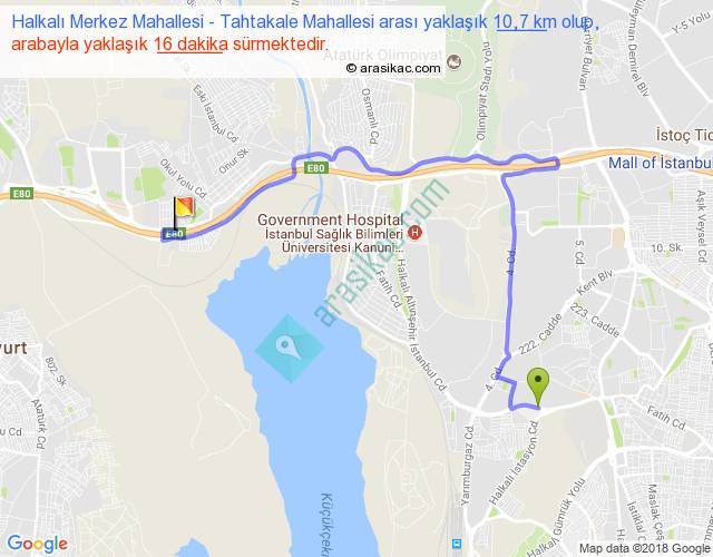 Halkalı Merkez Mahallesi - Tahtakale Mahallesi arası yaklaşık olarak 90 km/h ile yukarıda belirtilen sürede olup, iki yerin kuş uçuşu uzaklığı (mesafesi) 5'dir. Yolculuk otobüsle 20 dakika sürmektedir.