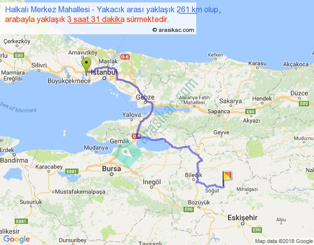 Halkalı Merkez Mahallesi - Yakacık arası yaklaşık olarak 90 km/h ile yukarıda belirtilen sürede olup, iki yerin kuş uçuşu uzaklığı (mesafesi) 166'dir. Yolculuk otobüsle 4 saat 34 dakika sürmektedir.
