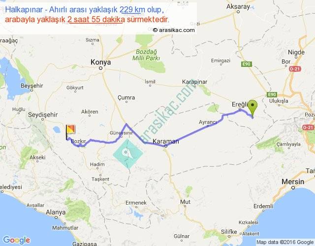 Halkapınar - Ahırlı arası yaklaşık olarak 90 km/h ile yukarıda belirtilen sürede olup, iki yerin kuş uçuşu uzaklığı (mesafesi) 183'dir. Yolculuk otobüsle 3 saat 47 dakika sürmektedir.