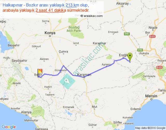Halkapınar - Bozkır arası yaklaşık olarak 90 km/h ile yukarıda belirtilen sürede olup, iki yerin kuş uçuşu uzaklığı (mesafesi) 173'dir. Yolculuk otobüsle 3 saat 29 dakika sürmektedir.