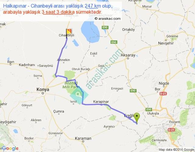 Halkapınar - Cihanbeyli arası yaklaşık olarak 90 km/h ile yukarıda belirtilen sürede olup, iki yerin kuş uçuşu uzaklığı (mesafesi) 174'dir. Yolculuk otobüsle 3 saat 57 dakika sürmektedir.
