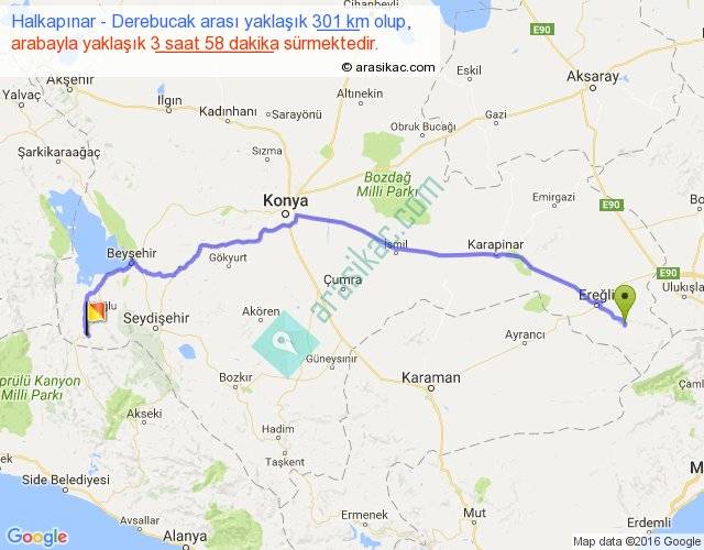 Halkapınar - Derebucak arası yaklaşık olarak 90 km/h ile yukarıda belirtilen sürede olup, iki yerin kuş uçuşu uzaklığı (mesafesi) 235'dir. Yolculuk otobüsle 5 saat 9 dakika sürmektedir.