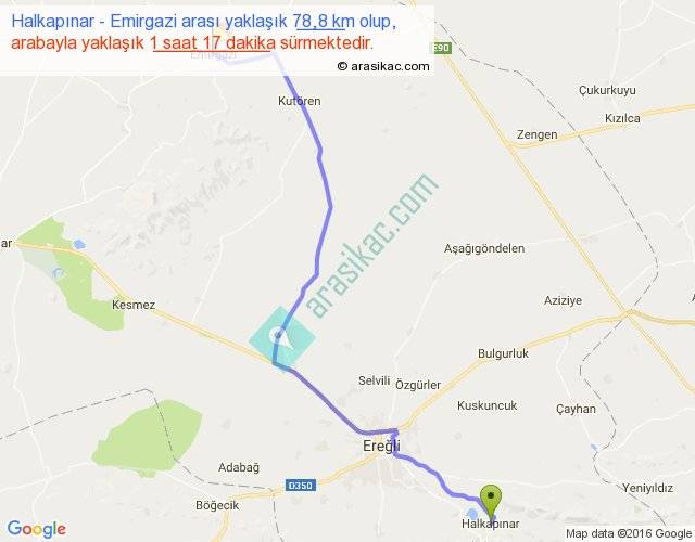 Halkapınar - Emirgazi arası yaklaşık olarak 90 km/h ile yukarıda belirtilen sürede olup, iki yerin kuş uçuşu uzaklığı (mesafesi) 60'dir. Yolculuk otobüsle 1 saat 40 dakika sürmektedir.