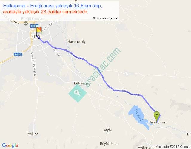 Halkapınar - Ereğli arası yaklaşık olarak 90 km/h ile yukarıda belirtilen sürede olup, iki yerin kuş uçuşu uzaklığı (mesafesi) 486'dir. Eğer belirtilen yerler arasında uçak seferi var ise bu süre uçakla 44 dakika'ya kadar düşebilir. Yolculuk otobüsle 9 saat 41 dakika sürmektedir.