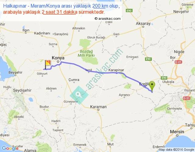 Halkapınar - Meram Konya arası yaklaşık olarak 90 km/h ile yukarıda belirtilen sürede olup, iki yerin kuş uçuşu uzaklığı (mesafesi) 171'dir. Yolculuk otobüsle 3 saat 16 dakika sürmektedir.