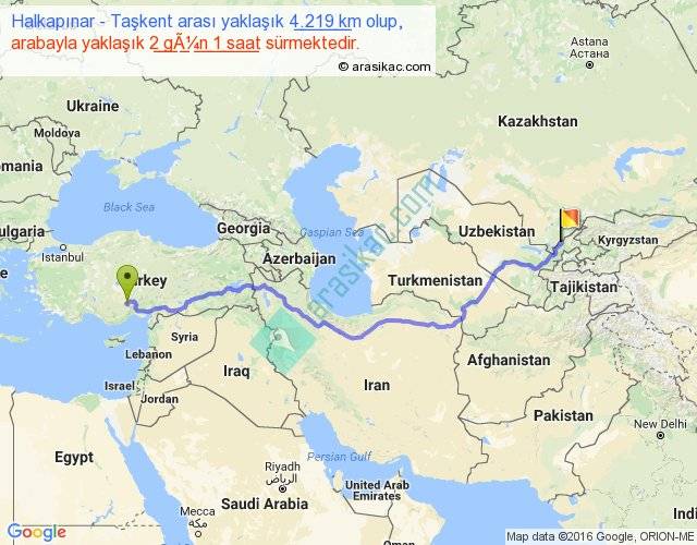 Halkapınar - Taşkent arası yaklaşık olarak 90 km/h ile yukarıda belirtilen sürede olup, iki yerin kuş uçuşu uzaklığı (mesafesi) 3005'dir. Eğer belirtilen yerler arasında uçak seferi var ise bu süre uçakla 4 saat 37 dakika'ya kadar düşebilir. Yolculuk otobüsle 2 gün 15 saat sürmektedir.