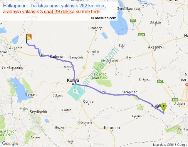 Halkapınar - Tuzlukçu arası yaklaşık olarak 90 km/h ile yukarıda belirtilen sürede olup, iki yerin kuş uçuşu uzaklığı (mesafesi) 251'dir. Eğer belirtilen yerler arasında uçak seferi var ise bu süre uçakla 23 dakika'ya kadar düşebilir. Yolculuk otobüsle 4 saat 44 dakika sürmektedir.