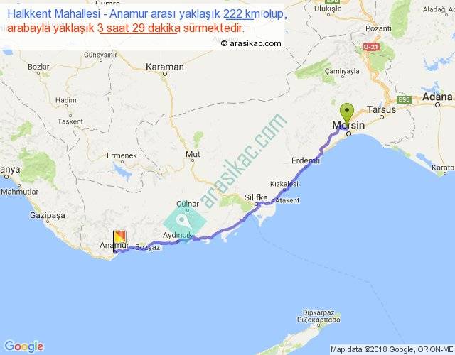 Halkkent Mahallesi - Anamur arası yaklaşık olarak 90 km/h ile yukarıda belirtilen sürede olup, iki yerin kuş uçuşu uzaklığı (mesafesi) 181'dir. Yolculuk otobüsle 4 saat 31 dakika sürmektedir.