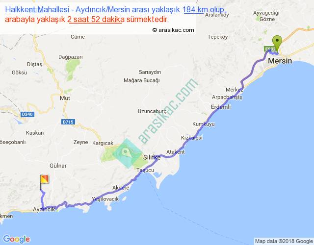 Halkkent Mahallesi - Aydıncık Mersin arası yaklaşık olarak 90 km/h ile yukarıda belirtilen sürede olup, iki yerin kuş uçuşu uzaklığı (mesafesi) 136'dir. Yolculuk otobüsle 3 saat 43 dakika sürmektedir.