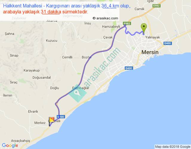 Halkkent Mahallesi - Kargıpınarı arası yaklaşık olarak 90 km/h ile yukarıda belirtilen sürede olup, iki yerin kuş uçuşu uzaklığı (mesafesi) 27'dir. Yolculuk otobüsle 40 dakika sürmektedir.