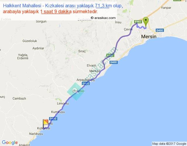 Halkkent Mahallesi - Kızkalesi arası yaklaşık olarak 90 km/h ile yukarıda belirtilen sürede olup, iki yerin kuş uçuşu uzaklığı (mesafesi) 60'dir. Yolculuk otobüsle 1 saat 29 dakika sürmektedir.