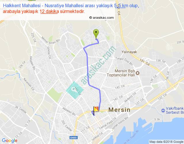 Halkkent Mahallesi - Nusratiye Mahallesi arası yaklaşık olarak 90 km/h ile yukarıda belirtilen sürede olup, iki yerin kuş uçuşu uzaklığı (mesafesi) 4'dir. Yolculuk otobüsle 15 dakika sürmektedir.