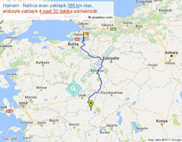 Hamam - Narlıca arası yaklaşık olarak 90 km/h ile yukarıda belirtilen sürede olup, iki yerin kuş uçuşu uzaklığı (mesafesi) 231'dir. Yolculuk otobüsle 5 saat 53 dakika sürmektedir.