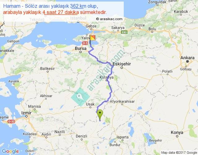 Hamam - Sölöz arası yaklaşık olarak 90 km/h ile yukarıda belirtilen sürede olup, iki yerin kuş uçuşu uzaklığı (mesafesi) 233'dir. Yolculuk otobüsle 5 saat 47 dakika sürmektedir.