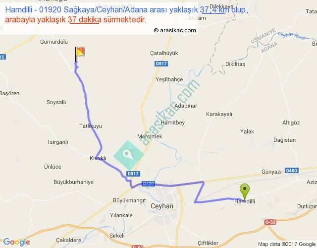 Hamdilli - 01920 Sağkaya Ceyhan Adana arası yaklaşık olarak 90 km/h ile yukarıda belirtilen sürede olup, iki yerin kuş uçuşu uzaklığı (mesafesi) 27'dir. Yolculuk otobüsle 48 dakika sürmektedir.