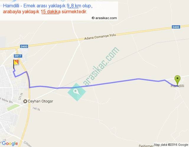 Hamdilli - Emek arası yaklaşık olarak 90 km/h ile yukarıda belirtilen sürede olup, iki yerin kuş uçuşu uzaklığı (mesafesi) 8'dir. Yolculuk otobüsle 19 dakika sürmektedir.