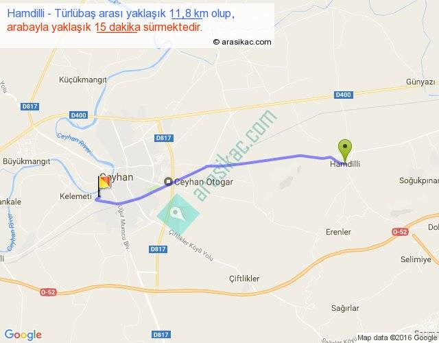 Hamdilli - Türlübaş arası yaklaşık olarak 90 km/h ile yukarıda belirtilen sürede olup, iki yerin kuş uçuşu uzaklığı (mesafesi) 11'dir. Yolculuk otobüsle 19 dakika sürmektedir.