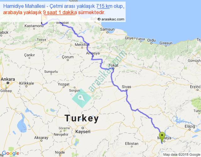 Hamidiye Mahallesi - Çetmi arası yaklaşık olarak 90 km/h ile yukarıda belirtilen sürede olup, iki yerin kuş uçuşu uzaklığı (mesafesi) 502'dir. Eğer belirtilen yerler arasında uçak seferi var ise bu süre uçakla 46 dakika'ya kadar düşebilir. Yolculuk otobüsle 11 saat 43 dakika sürmektedir.