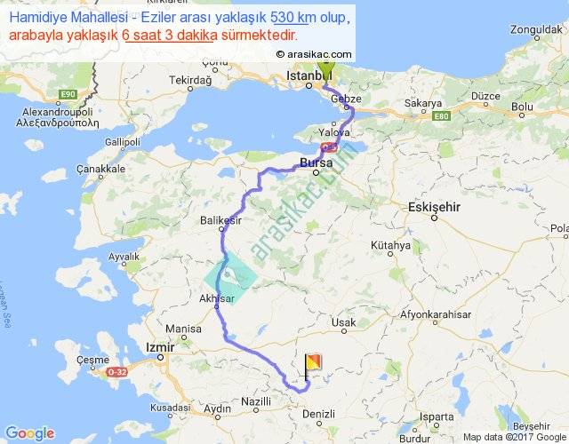Hamidiye Mahallesi - Eziler arası yaklaşık olarak 90 km/h ile yukarıda belirtilen sürede olup, iki yerin kuş uçuşu uzaklığı (mesafesi) 313'dir. Eğer belirtilen yerler arasında uçak seferi var ise bu süre uçakla 28 dakika'ya kadar düşebilir. Yolculuk otobüsle 7 saat 51 dakika sürmektedir.