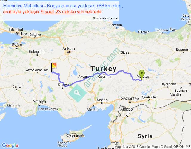 Hamidiye Mahallesi - Koçyazı arası yaklaşık olarak 90 km/h ile yukarıda belirtilen sürede olup, iki yerin kuş uçuşu uzaklığı (mesafesi) 575'dir. Eğer belirtilen yerler arasında uçak seferi var ise bu süre uçakla 53 dakika'ya kadar düşebilir. Yolculuk otobüsle 12 saat 11 dakika sürmektedir.