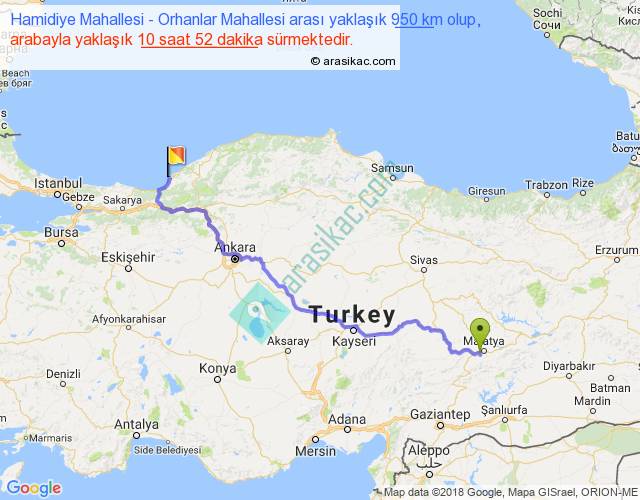 Hamidiye Mahallesi - Orhanlar Mahallesi arası yaklaşık olarak 90 km/h ile yukarıda belirtilen sürede olup, iki yerin kuş uçuşu uzaklığı (mesafesi) 668'dir. Eğer belirtilen yerler arasında uçak seferi var ise bu süre uçakla 1 saat 01 dakika'ya kadar düşebilir. Yolculuk otobüsle 14 saat 7 dakika sürmektedir.