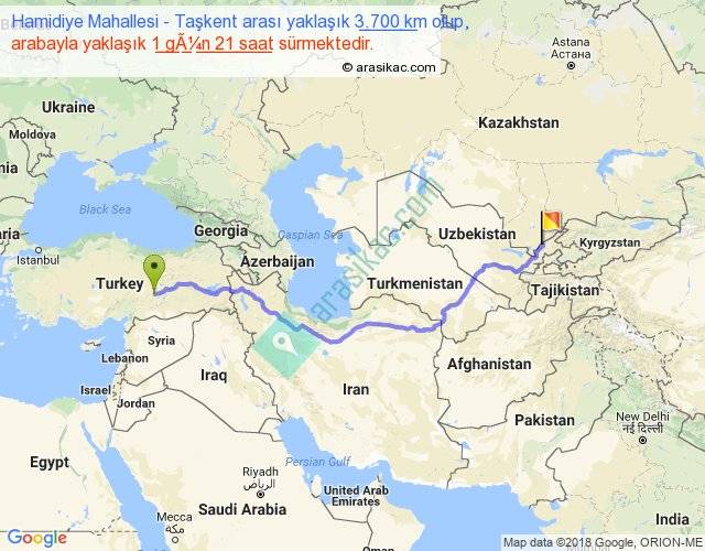 Hamidiye Mahallesi - Taşkent arası yaklaşık olarak 90 km/h ile yukarıda belirtilen sürede olup, iki yerin kuş uçuşu uzaklığı (mesafesi) 2639'dir. Eğer belirtilen yerler arasında uçak seferi var ise bu süre uçakla 4 saat 03 dakika'ya kadar düşebilir. Yolculuk otobüsle 2 gün 10 saat sürmektedir.