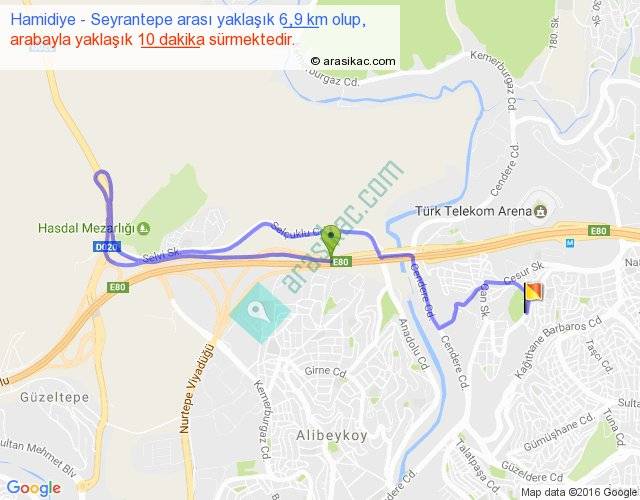 Hamidiye - Seyrantepe arası yaklaşık olarak 90 km/h ile yukarıda belirtilen sürede olup, iki yerin kuş uçuşu uzaklığı (mesafesi) 1'dir. Yolculuk otobüsle 13 dakika sürmektedir.