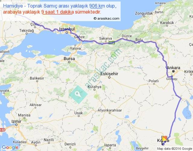 Hamidiye - Toprak Sarnıç arası yaklaşık olarak 90 km/h ile yukarıda belirtilen sürede olup, iki yerin kuş uçuşu uzaklığı (mesafesi) 604'dir. Eğer belirtilen yerler arasında uçak seferi var ise bu süre uçakla 55 dakika'ya kadar düşebilir. Yolculuk otobüsle 11 saat 43 dakika sürmektedir.