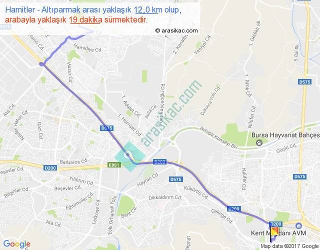 Hamitler - Altıparmak arası yaklaşık olarak 90 km/h ile yukarıda belirtilen sürede olup, iki yerin kuş uçuşu uzaklığı (mesafesi) 8'dir. Yolculuk otobüsle 24 dakika sürmektedir.