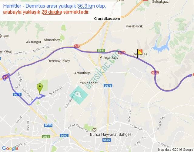 Hamitler - Demirtas arası yaklaşık olarak 90 km/h ile yukarıda belirtilen sürede olup, iki yerin kuş uçuşu uzaklığı (mesafesi) 10'dir. Yolculuk otobüsle 36 dakika sürmektedir.