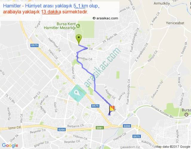 Hamitler - Hürriyet arası yaklaşık olarak 90 km/h ile yukarıda belirtilen sürede olup, iki yerin kuş uçuşu uzaklığı (mesafesi) 4'dir. Yolculuk otobüsle 16 dakika sürmektedir.
