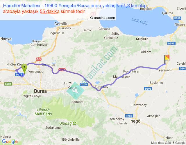 Hamitler Mahallesi - 16900 Yenişehir Bursa arası yaklaşık olarak 90 km/h ile yukarıda belirtilen sürede olup, iki yerin kuş uçuşu uzaklığı (mesafesi) 56'dir. Yolculuk otobüsle 1 saat 11 dakika sürmektedir.