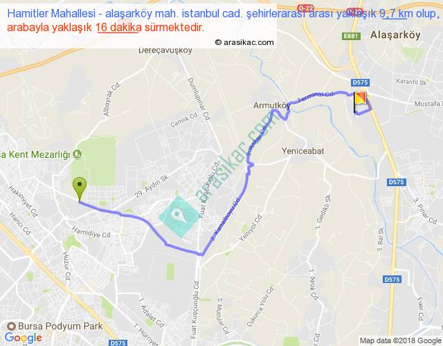 Hamitler Mahallesi - alaşarköy mah. istanbul cad. şehirlerarası arası yaklaşık olarak 90 km/h ile yukarıda belirtilen sürede olup, iki yerin kuş uçuşu uzaklığı (mesafesi) 6'dir. Yolculuk otobüsle 20 dakika sürmektedir.