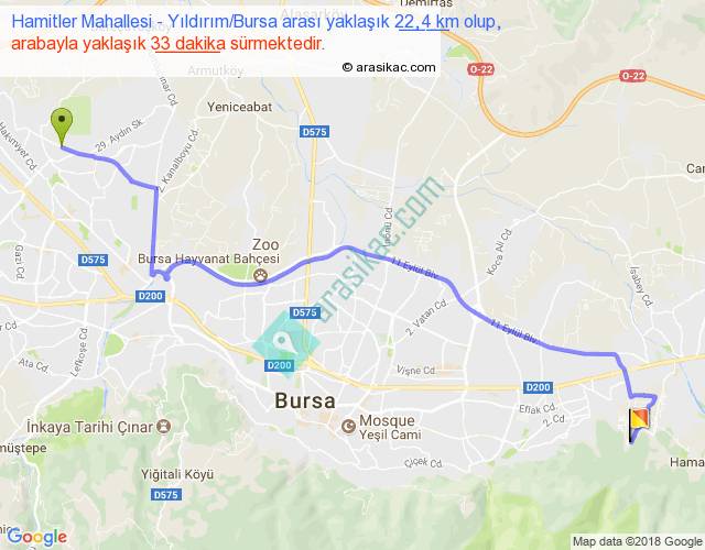 Hamitler Mahallesi - Yıldırım Bursa arası yaklaşık olarak 90 km/h ile yukarıda belirtilen sürede olup, iki yerin kuş uçuşu uzaklığı (mesafesi) 17'dir. Yolculuk otobüsle 42 dakika sürmektedir.