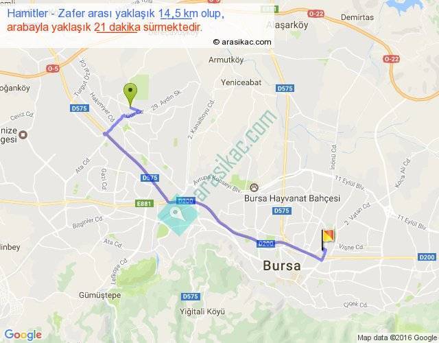 Hamitler - Zafer arası yaklaşık olarak 90 km/h ile yukarıda belirtilen sürede olup, iki yerin kuş uçuşu uzaklığı (mesafesi) 10'dir. Yolculuk otobüsle 27 dakika sürmektedir.