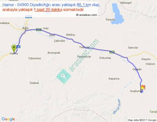 Hamur - 04900 Diyadin Ağrı arası yaklaşık olarak 90 km/h ile yukarıda belirtilen sürede olup, iki yerin kuş uçuşu uzaklığı (mesafesi) 63'dir. Yolculuk otobüsle 1 saat 44 dakika sürmektedir.