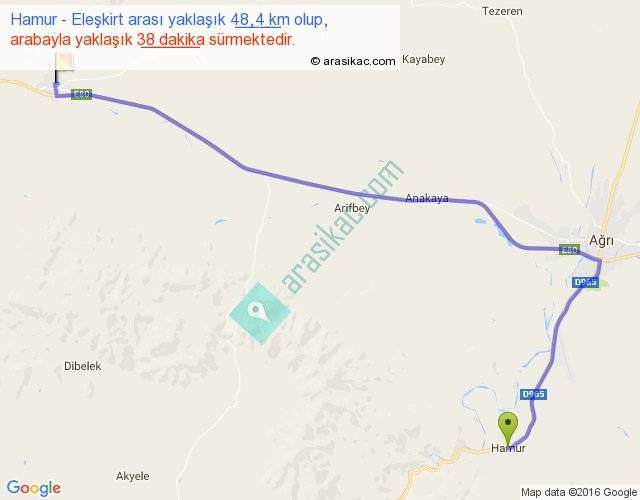 Hamur - Eleşkirt arası yaklaşık olarak 90 km/h ile yukarıda belirtilen sürede olup, iki yerin kuş uçuşu uzaklığı (mesafesi) 34'dir. Yolculuk otobüsle 49 dakika sürmektedir.