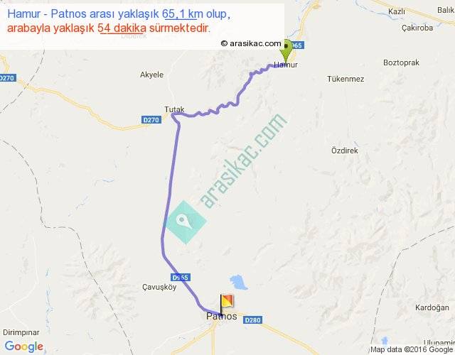 Hamur - Patnos arası yaklaşık olarak 90 km/h ile yukarıda belirtilen sürede olup, iki yerin kuş uçuşu uzaklığı (mesafesi) 43'dir. Yolculuk otobüsle 1 saat 10 dakika sürmektedir.