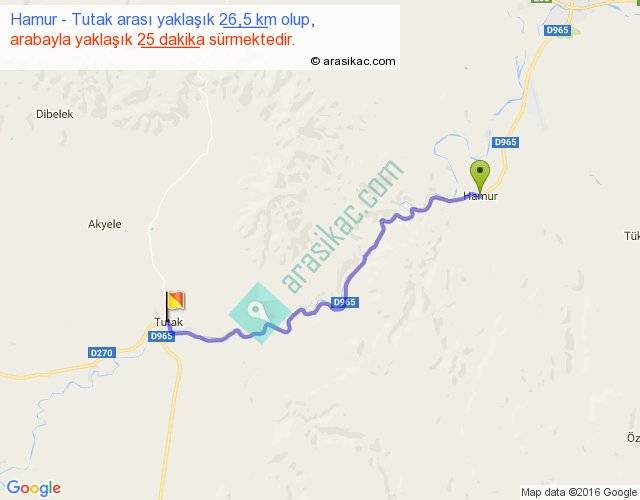 Hamur - Tutak arası yaklaşık olarak 90 km/h ile yukarıda belirtilen sürede olup, iki yerin kuş uçuşu uzaklığı (mesafesi) 20'dir. Yolculuk otobüsle 32 dakika sürmektedir.