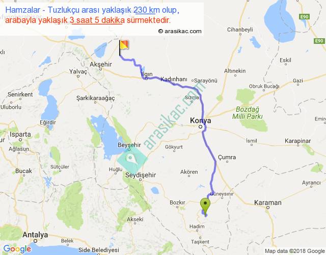 Hamzalar - Tuzlukçu arası yaklaşık olarak 90 km/h ile yukarıda belirtilen sürede olup, iki yerin kuş uçuşu uzaklığı (mesafesi) 171'dir. Yolculuk otobüsle 4 saat 0 dakika sürmektedir.