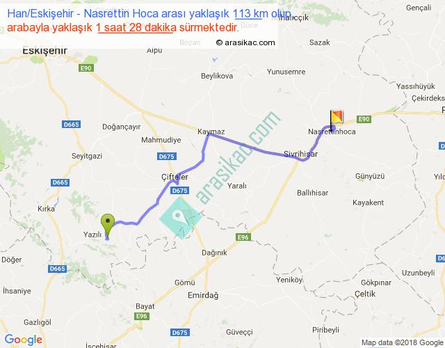 Han Eskişehir - Nasrettin Hoca arası yaklaşık olarak 90 km/h ile yukarıda belirtilen sürede olup, iki yerin kuş uçuşu uzaklığı (mesafesi) 84'dir. Yolculuk otobüsle 1 saat 54 dakika sürmektedir.